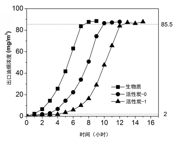 圖2:烹調煙氣的不同吸附劑的吸附穿透曲線。