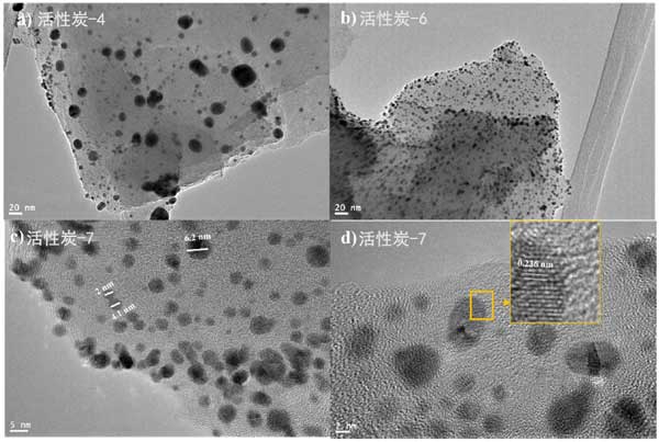 為了進一步研究金顆粒在活性炭表面的分布和結(jié)晶度,我們拍攝了鍍金活性炭樣品的透射電子顯微鏡圖像。圖7顯示了各種活性炭樣品在不同放大倍數(shù)下的TEM圖像。圖2a、b顯示了金納米粒子在活性炭表面上的分布。很明顯,兩個樣本的分布是均勻的;钚蕴-4和活性炭-6似乎都以類似的方式相互作用和承載金納米粒子;钚蕴-7樣品的高分辨率TEM圖像如圖2c、d所示。圖2c顯示大多數(shù)金納米顆粒很小,直徑為3-5nm,并且只能看到少數(shù)團聚顆粒。圖2d顯示了金的晶格條紋間距。發(fā)現(xiàn)晶格條紋間距為0.217nm,對應(yīng)于金晶面的面。此外,我們試圖通過TEM圖像估計顆粒尺寸的分布,我們發(fā)現(xiàn)所有樣品中超過80%的金顆粒的尺寸小于5nm。