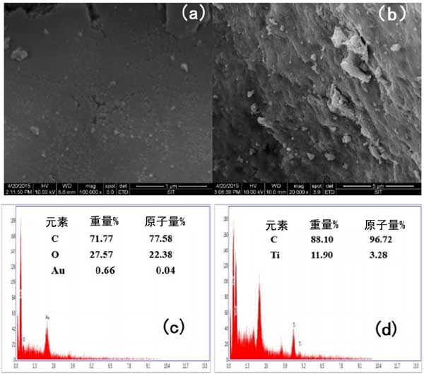 活性炭載二氧化鈦是通過溶膠-凝膠法合成的。在室溫下,將待載溶解在無(wú)水乙醇中,然后將冰醋酸緩慢加入漿液中。用濃鹽酸將溶液的pH值調(diào)至2-3。隨后,懸浮液在室溫下攪拌30分鐘并超聲10分鐘得到改性活性炭。SEM圖像及其對(duì)活性炭和載二氧化鈦活性炭的EDX分析如圖1所示?梢郧宄乜吹交钚蕴烤哂胁灰(guī)則的多孔結(jié)構(gòu),分布密度高。EDX上的元素映射表明C、O和Au的百分比分別為77.77%、27.57%和0.66%。應(yīng)該注意的是,Au主要來(lái)自用于增強(qiáng)導(dǎo)電性的鍍金膜。發(fā)現(xiàn)二氧化鈦顆粒分散在活性炭的表面。此外,在載二氧化鈦的活性炭上可觀察到粗糙的多孔結(jié)構(gòu),證實(shí)了二氧化鈦在活性炭表面形成。