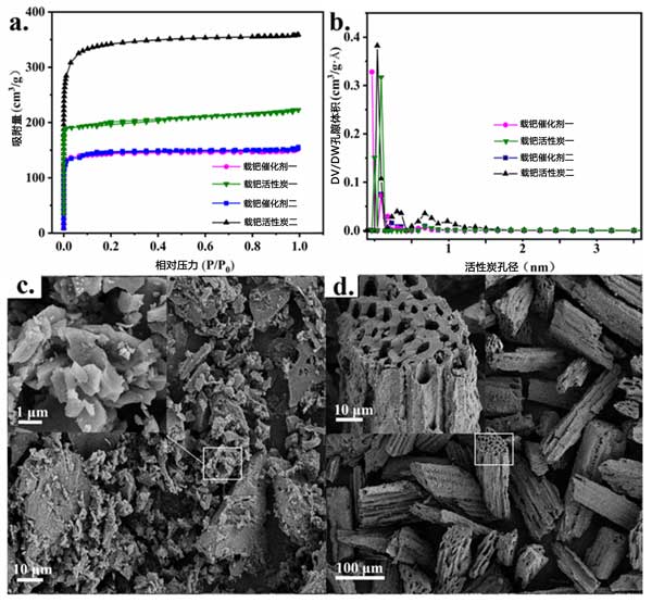 圖2:(a)N2吸收-解吸等溫線和(b)各種催化劑的孔徑分布。(c)活性炭催化劑一和(d)催化劑二的SEM圖像。