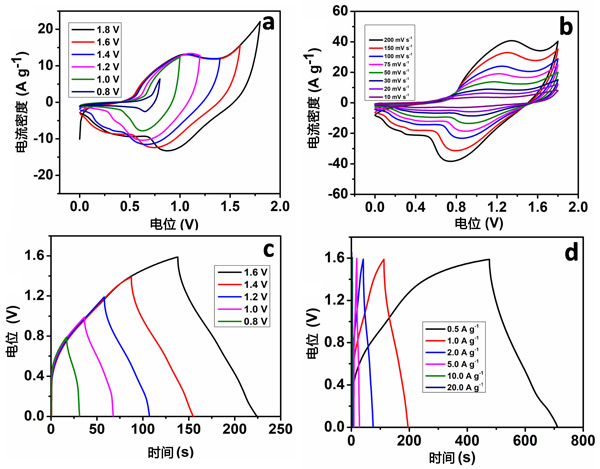 超級電容器裝置的制造是集成陰極(氧化鎳),陽極(活性炭)使用纖維素濾紙(在2.0M/KOH電解液中浸泡放置)分離,然后用絕緣膠帶包裹。陽極和陰極具有相似的幾何表面積,再經(jīng)過合適的重量比來制成電容器。圖2a顯示了超級電容器件在各種截止區(qū)域中的CV曲線,掃描速率為50mVs-1。從圖中可以看出,電容器件的CV曲線呈現(xiàn)出典型的準(zhǔn)矩形電容性能,這對應(yīng)于雙電層電容器和贗電容的相互貢獻(xiàn)。此外,當(dāng)增加工作截止區(qū)時(shí),會發(fā)生更多的法拉第電化學(xué)反應(yīng)。當(dāng)工作電位超過1.7V時(shí),也會在CV曲線上注意到氧氣的釋放;钚蕴/氧化鎳器件很大程度上取決于截止區(qū)域。因此,選擇1.6V作為隨后研究超級電容器件電化學(xué)性能的潛在窗口區(qū)域。圖2b顯示了活性炭電容器件在0到1.6V的截止區(qū)域內(nèi)的各種掃描速率下的CV曲線。電流密度隨著掃描速率的增加而增加,并且氧化峰電位轉(zhuǎn)移到更正的電位,類似三電極器件的結(jié)果。