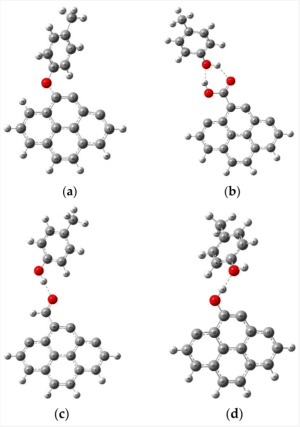 預(yù)計(jì)甲酚在活性炭上的吸附將通過各種類型的相互作用進(jìn)行,例如電子供體-受體機(jī)制、靜電相互作用、π-π相互作用和氫鍵形成。然而,在各種類型的相互作用中,活性炭和被吸附物之間的氫鍵是有助于吸附過程的重要相互作用類型之一。因此,在本研究中,使用DFT方法研究了對(duì)甲酚和活性炭之間的氫鍵相互作用。考慮到它們之間的氫鍵,研究了對(duì)甲酚與原始活性炭和功能化活性炭的相互作用。圖1代表各種相互作用的優(yōu)化結(jié)構(gòu)。
