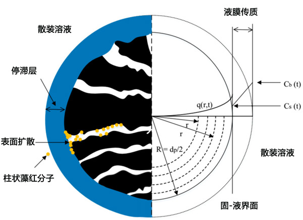 在第一實驗階段獲得的吸附平衡測試的實驗數(shù)據(jù)適合等溫線模型Langmuir、Freundlich和Redlich-Peterson。將最適合吸附平衡數(shù)據(jù)的等溫線模型的參數(shù)值應用于HSDM模型,以模擬SBA柱中的吸附過程。該模型考慮了發(fā)生在兩個連續(xù)擴散步驟中的吸附過程,即:通過活性炭顆粒周圍的固定流體層擴散(膜擴散)和通過活性炭內部孔的擴散(表面擴散),如圖2所示。