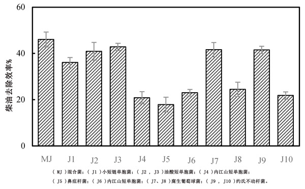圖1:經(jīng)篩選的菌株培養(yǎng)后對(duì)柴油的去除率。