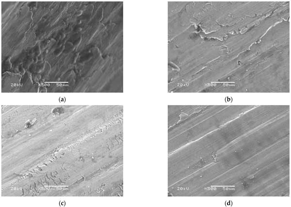 通過(guò)觀察摩擦學(xué)測(cè)試的結(jié)果,很明顯平均磨痕直徑和質(zhì)量損失的減少結(jié)果具有相似的趨勢(shì)。然而,當(dāng)將活性炭添加到潤(rùn)滑脂中時(shí),質(zhì)量損失值顯示出更陡峭的趨勢(shì)。為了進(jìn)一步了解質(zhì)量損失結(jié)果以及表面的磨痕形貌,應(yīng)用了與能量色散X射線(EDX)系統(tǒng)集成的SEM。測(cè)試氣缸磨痕的EDX光譜是針對(duì)放大500倍的SEM圖像確定的,以便從磨痕的表面軌跡中獲得關(guān)于接觸表面上的摩擦膜的沉淀元素(碳和氧)的必要信息。圖3顯示了以500倍放大倍率成像時(shí)的磨損表面形態(tài)。在具有粗糙表面形態(tài)的商業(yè)油脂樣品的情況下,圖像描繪了淺槽和深槽(圖3a)。另一方面,活性炭樣品和2wt.%其他樣品的磨損表面(圖3b,c)顯示出淺槽,帶有少量深槽點(diǎn)和光滑的形貌,而在0.5wt.%活性炭+2wt.%其他樣品的混合樣品僅顯示出薄槽(圖3d)。