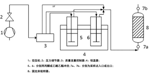 丙酮和乙酸乙酯蒸氣的混合物用作吸附物。圖1說明了實驗裝置的方案。將含有純化合物的沖洗液置于設定為15℃的恒溫器中。質(zhì)量流量控制器用于設置每個組分的流速。根據(jù)組分的蒸氣壓選擇流速,以使每種吸附物的初始濃度為100mg/L。氣流如下:丙酮:0.1L/min,乙酸乙酯:0.05L/min,和空氣:0.135L/min。將空氣與丙酮和乙酸乙酯蒸氣的混合物從下方引導至吸附床,并將10g吸附劑置于吸附器中。在吸附器的入口處采集氣體樣品以在此過程中每5分鐘測定一次吸附物和吸附器出口的初始濃度,以確定吸附物濃度的變化。這些測量是使用帶有火焰離子化檢測器進行的,直到乙酸乙酯的出口濃度達到其初始濃度的90%。色譜分析參數(shù)如下:空氣流量:350mL/min,氫氣流量:35mL/min,尾吹氣流量(He):30mL/min,入口溫度:100℃,分流比:15。