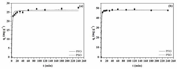 研究了初始吸附物濃度為50mgL-1和pH4的兩種活性炭的亮藍(lán)染料染料吸附動力學(xué)行為。作為時間函數(shù)的吸附容量曲線分別如圖3a、b所示,分別為活性炭1和2?梢杂^察到活性炭2獲得的曲線的特征在于更快的吸附速率。活性炭2在大約10分鐘內(nèi)達(dá)到平衡。對于活性炭1,在大約60分鐘內(nèi)達(dá)到平衡。由于活性炭1呈現(xiàn)的較高總孔體積,可以解釋這種行為。高孔體積可以通過允許染料分子在孔內(nèi)更快地擴(kuò)散到吸附位點(diǎn)來增強(qiáng)吸附動力學(xué)。