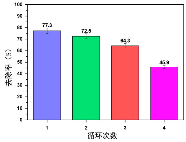 通過回收研究調(diào)查了改性活性炭的再利用以從廢水中去除活性黑5。進(jìn)行實(shí)驗(yàn)時(shí),最初使用100mg/L活性黑5和0.8g/L的改性活性炭,pH值為2。在第一個(gè)循環(huán)之后,使用0.01M/NaOH溶液對(duì)所使用的改性活性炭顆粒進(jìn)行處理大約2小時(shí)。此后,用蒸餾水沖洗顆粒以除去任何殘留的堿。選擇被認(rèn)為可接受的重復(fù)時(shí)間,以便能夠在后續(xù)循環(huán)中重復(fù)使用吸附劑。研究結(jié)果如圖3所示。在用1M/NaOH處理成功再生后,解吸的改性活性炭能夠重復(fù)使用多達(dá)四個(gè)循環(huán)以去除活性黑5;钚院5的去除百分比在第一個(gè)循環(huán)中約為77.3%,在第四個(gè)循環(huán)后下降至約45.9%。總的來說,這項(xiàng)研究證明了將改性活性炭吸附劑重復(fù)使用四個(gè)循環(huán)以從廢水中去除活性黑5的潛力。