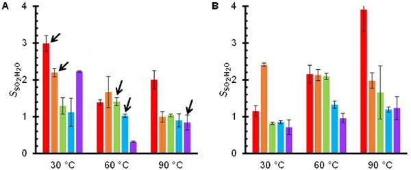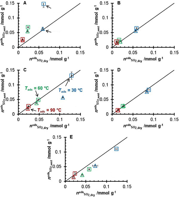 圖1:五種活性炭在濕煙氣與干煙氣混合物中吸附的SO2量。圖中顯示了T=30℃(藍(lán)色)、60℃(綠色)和90℃(紅色)實(shí)驗(yàn)結(jié)果。