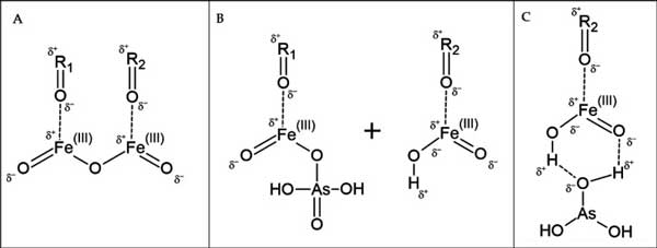 圖3:(A)顯示物理吸附到活性炭表面的鐵。(B)顯示了由于暴露于砷而形成的兩種鐵產(chǎn)物FeOOH和中間體FeO–O–AsH2O3。(C)顯示了還原的As(III),這是電子從活性炭流過鐵的結(jié)果,通過氫鍵物理吸附到載鐵表面。