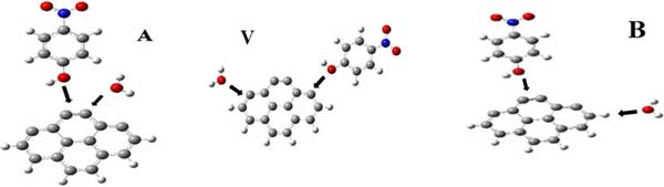 如上所述,為了啟動對復合物優(yōu)化結構的系統(tǒng)搜索,硝基苯酚和水分子均以選定的方向放置在距活性炭表面3Å的位置,覆蓋主體周圍的整個物理空間。兩個分子被設計為從不同的相對方向相互接近:(1)兩者都從本體的同一側進行攻擊(A-初始構型),(2)攻擊來自本體的相對側(V-初始構型),(3)兩個分子遵循垂直路徑(B-初始構型)。這三種方法如圖2所示。選定的初始構型AB區(qū)分通過化學吸附或通過物理吸附連接的復雜結構的形成。配置A有利于物理吸附,而配置V和B分別有利于完全和部分化學吸附。