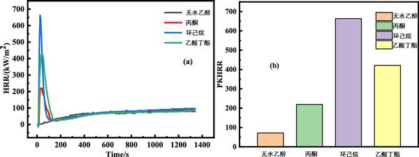 圖4b顯示了四個(gè)樣品的最大放熱率(PkHRR),其順序?yàn)榄h(huán)己烷(663.41kW/m2)>乙酸丁酯(421.4kW/m2)>丙酮(219.49kW/m2)>純無(wú)水乙醇(71.4kW/m2)。觀察到3個(gè)VOCs吸附樣品的PkHRR遠(yuǎn)高于ROW,其中環(huán)己烷樣品的Pk放熱率最高,表明CYH樣品的燃燒危害最嚴(yán)重。