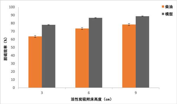 柴油和模型柴油用作油原料,以評(píng)估活性炭和改性活性炭的脫硫工藝。柴油初始硫濃度為7510ppm。兩種柴油原料用于固定床吸附塔裝置的脫硫工藝。為了進(jìn)行脫硫?qū)嶒?yàn),使用計(jì)量泵將油原料送入塔中。采用垂直向下固定床吸附塔裝置連續(xù)吸附硫化合物,流量為1mLs-1。柱子逐漸裝載不同高度的活性炭層(3-9厘米),對(duì)應(yīng)于不同的活性炭重量(10、7和4克)。