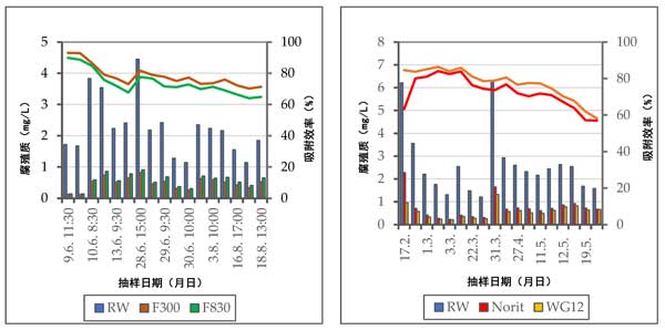 圖2:原水中和處理后的水中腐殖質(zhì)的濃度以及吸附材料的效率。