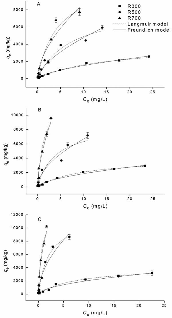 活性炭樣品上四環(huán)素的吸附等溫線如圖1所示。吸附數(shù)據(jù)顯示與Langmuir和Freundlich模型都很好,R 2系數(shù)高于0.919 。對于Freundlich模型中的參數(shù),不同樣品的n值相近(0.53-0.62),小于1,說明吸附是濃度依賴性過程。反映樣品吸收四環(huán)素能力的K f的值在700℃熱解產(chǎn)生的活性炭中最高。q max表示的趨勢Langmuir模型中的值也表明吸附容量隨著熱解溫度的增加而增加。計算最大吸附容量在大約11,834-14,157mg / kg的范圍內(nèi)。表面積是已知的是影響活性炭的吸附能力的一個重要因素,尤其在去除四環(huán)素的情況下。這在本研究中得到證實,活性炭樣品的表面積(S BET)與q e值顯著正相關。在較高的熱解溫度下,活性炭樣品的表面積增加,吸附能力增加。