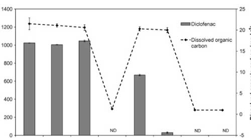 使用活性炭除去雙氯芬酸鈉是定性高效的,通過零吸收和低濃度的DOC的,并且在通過所獲得的色譜中沒有檢測到雙氯芬酸鈉。得在所研究的處理階段中,在活性炭上的吸附導(dǎo)致最顯著的雙氯芬酸鈉去除。因此,雙氯芬酸鈉沒有水樣中的這個階段(LOD之后檢測 = 2 μg L−1)?紤]到所述方法的定量限為3 μg L−1,通過活性炭除去雙氯芬酸鈉的至少99.7%。因?yàn)闆]有研究活性炭的破裂曲線,所以活性炭的結(jié)果可以被認(rèn)為是定性的。然而,為了研究在大型水處理廠中去除雙氯芬酸鈉,必須改進(jìn)該方法以達(dá)到較低的檢測限(約μg L−1)。