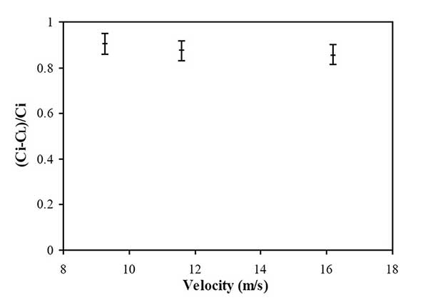 旋風(fēng)分離器系統(tǒng)對(duì)應(yīng)于具有強(qiáng)大的慣性力場的移動(dòng)床粒子。雖然活性炭尺寸和流速兩個(gè)參數(shù)在吸附過程中都起著關(guān)鍵作用,但顆粒尺寸有更明顯的趨勢(shì);趧×业耐牧,高流速形成更好的混合條件,但使吸附劑顆粒的停留時(shí)間極短,這可能降低與旋風(fēng)分離器內(nèi)的目標(biāo)氣體流動(dòng)的接觸概率。例如,350升/分鐘(1pm)的流速導(dǎo)致16.2米/秒的入口速度,從而導(dǎo)致在旋風(fēng)分離器的混合室內(nèi)停留時(shí)間大約為0.14秒。因此,為了有效利用活性炭顆粒直至完全吸附,顆粒應(yīng)盡可能多次重復(fù)使用。