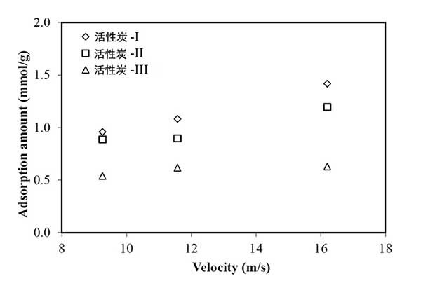 間歇填充床試驗(yàn)中,活性炭對(duì)于甲苯蒸氣的吸附容量,即最大容許吸附量,從各種尺寸的活性炭的等溫實(shí)驗(yàn)中發(fā)現(xiàn)為0.01-0.03mol / g。第一次施加到以16.2米/秒運(yùn)行的旋風(fēng)分離器的新鮮吸附劑的吸附量對(duì)于活性炭-I是1.4mmol / g,對(duì)于活性炭-II是1.2mol / g和對(duì)于活性炭-III,如圖2所示。它僅僅小于活性炭吸附劑潛在容量的1/10。該旋風(fēng)分離器中甲苯的吸附量與交流流化床反應(yīng)器的體積(3.3〜5.4mmol / g 活性炭)相當(dāng)競爭。至于尺寸效應(yīng),小顆粒提供大單位體積的表面積,這可以呈現(xiàn)更多潛在的吸附位點(diǎn)。對(duì)于活性炭-I、II、III,各尺寸范圍的面積分別為1145,1034和912m2/ g。