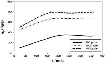 圖3:不同初始濃度對(duì)活性炭吸硫能力的影響(吸附劑用量:20 mg / L,溫度:25°C,攪拌時(shí)間:360 min)。
