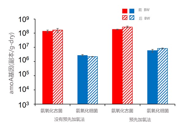 圖3:在“無(wú)預(yù)氯化”和“預(yù)氯化”的采樣時(shí)間之前(實(shí)心棒)和之后(帶斜線的棒)反洗的活性炭上AOA和AOB的豐度。