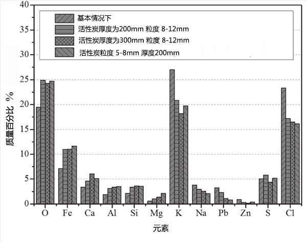 圖4顯示了煙氣通過活性炭之前和之后的化學(xué)組成。可以發(fā)現(xiàn)PM 2.5中的+ Fe,Ca,Si,Al和Mg的含量在煙氣通過活性床時(shí)比基礎(chǔ)情況下都有所增加,而K,Na,Pb的含量, PM 2.5中的 Zn和Cl都出現(xiàn)了下降。圖5給出了煙氣經(jīng)過活性炭層后在過濾器中收集的PM 2.5的SEM圖像,觀察到經(jīng)活性炭去除后,較大顆粒的數(shù)量主要由K和Cl組成減少(圖5)(b)-5(d))與基本情況比較(圖5(a))雖然有許多較小的顆粒,如球形顆粒(圖5(d)),主要包含F(xiàn)e和Ca這種現(xiàn)象與PM 2.5的化學(xué)成分變化非常一致。此外,與使用厚度為200毫米,粒度為8-12毫米的活性炭床的情況相比(圖5(b)),出現(xiàn)了較少的大的富含K-Cl的顆粒,并且出現(xiàn)了許多較小的球形富含F(xiàn)e-Ca的顆粒。