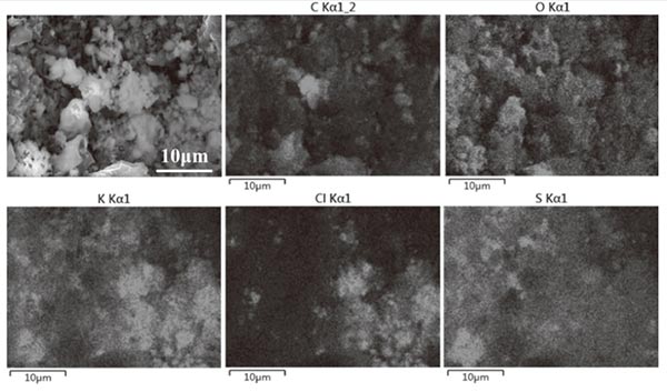 圖5顯示了粘附顆粒物質(zhì)后活性炭的形態(tài),其中可以發(fā)現(xiàn)許多顆粒分布在活性炭的孔隙或表面上。圖5(a)-5(c)中示出了分布在孔隙尺寸約20顆粒 μ米,5-10 μm和1 μ米。圖5(d)示出了分布式活性炭的表面上的顆粒,其直徑幾乎小于1 μ微米。圖6給出了分布在孔隙中的顆粒的SEM映射,表明大量顆粒富含K,并且它們主要以氯化物或硫酸鹽的形式存在。這些顆粒的出現(xiàn)對(duì)應(yīng)于PM 2.5中K和Cl含量的降低。