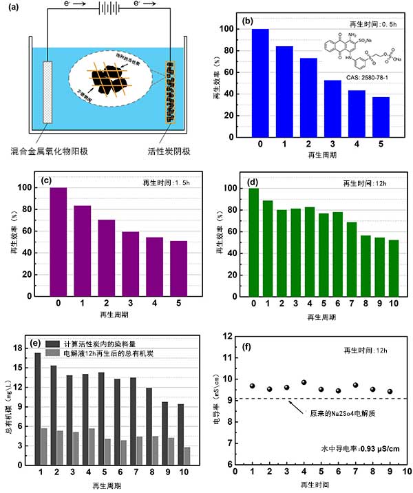 裝載RB19的活性炭在不同時間(例如,0.5小時,1.5小時和12小時)再生。還進行了連續(xù)吸附-再生循環(huán)。如在介紹圖1的B-d,再生效率(RE)高達84.1%,83.4%,和88.7%的下分別為0.5小時,1.5小時,和12個小時,再生時間來實現(xiàn),這表明(該方法的有效性圖1a顯示了方法的示意圖)。然而,在5次吸附-再生循環(huán)后,0.5小時的再生時間導(dǎo)致<50%RE,而1.5小時的再生時間略高于50%RE。最重要的是,12小時的再生時間顯著改善了循環(huán)性能;馗布词乖10個循環(huán)后仍可達到52.3%(圖1d)。這些結(jié)果與上電化學(xué)方法等的研究,其表明相一致,即較長的再生時間導(dǎo)致較高的RE。表明該方法可以回收一些活性炭的孔隙體積。
