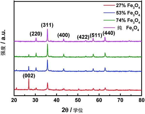 使用XRD衍射儀測量活性炭復(fù)合物的晶體結(jié)構(gòu)。圖1顯示了所制備樣品的衍射圖案。在2的特征衍射峰θ= 31.24°,36.82°,44.76°,55.62°,59.30°和65.19°的與(220),(311),(400),(422),(511)和(440)Fe 3 O 4平面一致。此外,在約2峰值θ=26.20°被分配給蓬松結(jié)構(gòu)化活性炭。觀察到Fe 3 O 4衍射峰的強(qiáng)度隨著Fe 3 O 4納米顆粒負(fù)載量的增加而增強(qiáng),并且活性炭的強(qiáng)度在相同的過程中減少。上述現(xiàn)象表明Fe 3 O 4納米顆粒可以成功地引入蓬松結(jié)構(gòu)的活性炭上。