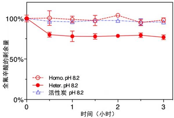 在存在和不存在活性炭的情況下,在密封的40mL燒瓶中在酸性,中性和堿性pH條件下進(jìn)行全氟辛酸與S 2 O 8的反應(yīng),反應(yīng)溫度為80℃,用恒溫水浴保持。對于大多數(shù)實(shí)驗(yàn),初始全氟辛酸濃度為0.5μM,活性炭濃度為200 mg/L,500 mg/L或1000 mg/L。對于酸性和堿性條件實(shí)驗(yàn),使用濃硫酸或150mM氫氧化鈉溶液將pH值調(diào)節(jié)至1.0或13.0。對于在pH 8.2下進(jìn)行的實(shí)驗(yàn),使用100mM硼酸鹽作為緩沖液(NaB(OH)4/H 3 BO 4)。在所有實(shí)驗(yàn)中包括五個(gè)重復(fù)。