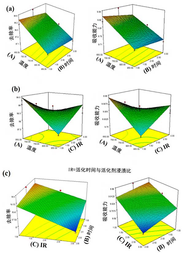 圖1:活性炭的(a)活化溫度和浸漬比(b)活化溫度和活化時(shí)間(c)浸漬比和活化時(shí)間,去除率和吸附能力對(duì)表面響應(yīng)曲線(xiàn)的影響。