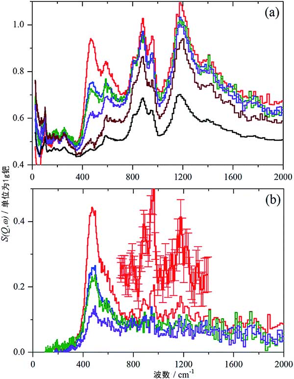 對(duì)于活性炭樣品中的每一個(gè),氫氣在飽和壓力(700毫巴)下記錄IINS光譜,然后逐漸使每個(gè)活性炭脫氫,首先使其在室溫下脫氣不同時(shí)間并且然后在200°C下放置12小時(shí)。圖2顯示了標(biāo)準(zhǔn)化光譜活性炭和活性炭負(fù)載鈀的差異光譜,(a)記錄的標(biāo)準(zhǔn)化光譜,氫氣從上到下在700毫巴下,抽真空至9毫巴,抽空至3毫巴,在200℃下抽真空放置12小時(shí),在200℃下第二次抽真空后放置12小時(shí)的活性炭。(b)減去在200℃下第二次抽空過(guò)夜的樣品后的差異光譜,從上到下:氫氣在700毫巴下,抽真空至9毫巴,抽真空至3毫巴,在200℃抽真空放置12小時(shí)后的活性炭負(fù)載鈀催化劑。