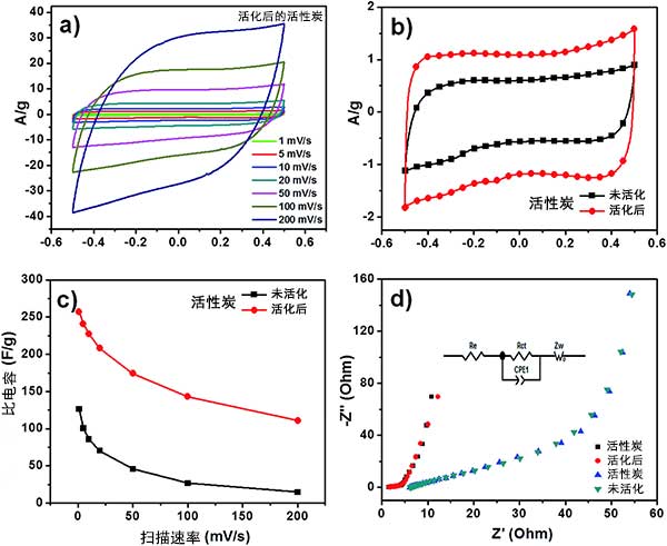 在不同掃描速率下觀察到兩種活性炭的準(zhǔn)矩形CV曲線(圖3a),這暗示了非理想的電容行為。我們還觀察到活化后的活性炭的CV環(huán)路較大,這意味著它具有比未活化的活性炭更大的電容(圖3b)。具體電容的總結(jié)如圖3c所示,活化后活性炭獲得的高電容為270,而沒活化的活性炭為125。這種高電容可歸因于諸如高表面積,分級孔徑分布和活性炭的表面潤濕性等因素。對于兩種活性炭,由于電解質(zhì)不足以擴(kuò)散到電極材料的內(nèi)孔中而觀察到對應(yīng)于掃描速率增加的比電容的降低。
