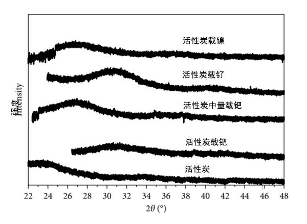 活性炭載三種金屬的衍射圖如圖2所示。在該圖中,可以看出金屬樣品或活性炭沒有確定的信號(hào),這可能表明所有樣品中都沒有結(jié)晶相,或晶體非常小(<100)。不存在結(jié)晶是由于樣品的低金屬負(fù)載量低于X射線衍射設(shè)備的檢測極限的結(jié)果。