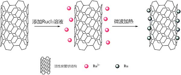 所有載釕活性炭上的釕負(fù)載量理論上為5%。通常,將活性炭加入120mL乙二醇中。并將混合物在超聲處理30分鐘以確保活性炭均勻分散。超聲處理后,在連續(xù)攪拌下滴加3.0mL RuCl 3水溶液30分鐘。然后是使用NaOH乙二醇溶液將混合物的pH調(diào)節(jié)至4.0。然后,在連續(xù)攪拌24小時(shí)后,將溶液放入微波合成反應(yīng)器中加熱100秒。過濾混合物溶液,用去離子水洗滌直至濾液的pH達(dá)到7.0,并在80℃下真空干燥。將樣品研磨成粉末使用。由于活性炭的表面是疏水的,它們傾向于在極性溶劑中聚集。并且由官能團(tuán)改性的活性炭可以提供足夠的孔隙以使釕納米顆粒均勻地分布在活性炭的表面上。在通過微波加熱的多元醇方法制備活性炭負(fù)載的釕納米顆粒。合成過程如圖1所示。