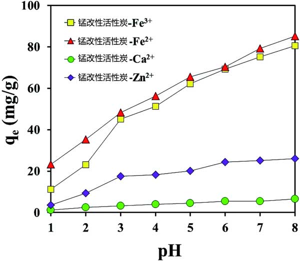 圖2:pH對高錳酸鉀改性活性炭吸附金屬陽離子的影響。