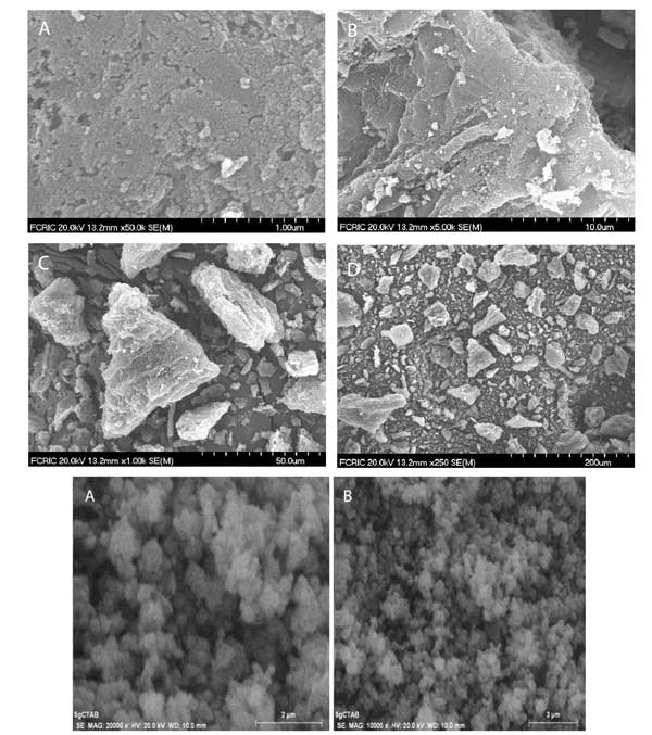 圖1呈現(xiàn)活性炭的掃描電子顯微鏡(SEM)圖像,其示出了活性炭的結(jié)構(gòu)和表面表征。圖像顯示碳顆粒的平均尺寸為約20nm,并且這些顆粒聚集在一起并形成平均尺寸為25μm的角形簇?紫堵蕿17.78%?梢钥闯龃氐谋砻媸瞧教沟模植诘暮投嗫椎。最后兩幅顯示的活性炭摻雜二氧化鈦的圖像。在嚴(yán)格攪拌下,將丁醇鈦溶液加入到含有活性炭的擬均勻溶液中,可能形成二氧化鈦,其中活性炭顆粒將其裝飾。