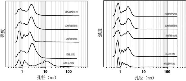 圖3:用硝酸和活化處理的活性炭的孔徑分布。