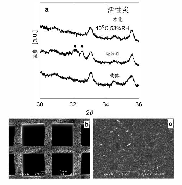 圖1a顯示了在40℃和相對濕度為53%下水合處理后活性炭載體,吸附劑和活性炭X射線衍射圖。由于碳酸鉀倍半水合物的反射特性的存在證實了鹽在載體上的負(fù)載。由于載體中加載的鹽量低,解釋了這些反射的低強(qiáng)度,5.58wt%。其余的峰對應(yīng)于載體中的不同相,例如碳和二氧化硅。圖1b顯示了活性炭載體的SEM照片。如圖中所看到的圖中,信道是正方形幾何形狀的具有每邊1.979±0.006毫米的長度,并且所述通道之間的壁的厚度是0.651±0.022毫米。圖1c示出了通道的內(nèi)壁的表面上,他們看起來很同質(zhì)。