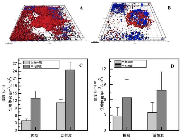 為了分析由于在膜生物反應(yīng)器中添加活性炭而導(dǎo)致生物膜形成增加的可能性,并進(jìn)一步闡明活性炭反應(yīng)器中膜性能下降幅度更大的原因,在第一個(gè)處理結(jié)束時(shí)進(jìn)行了檢測(圖2A,B)。在比較兩個(gè)反應(yīng)器之間生物膜結(jié)構(gòu)的性質(zhì)時(shí),可以觀察到活性炭反應(yīng)器通量下降的增加顯然與生物膜生長的幅度有關(guān)。在第一次膜生物反應(yīng)器運(yùn)行結(jié)束時(shí)從模塊上獲取的兩塊膜上生物膜的CLSM分析顯示,活性炭和對照反應(yīng)器之間細(xì)胞的生物體積及其自相關(guān)EPS的差異很大(圖2)。當(dāng)補(bǔ)充活性炭時(shí),生物膜生長的升高支持了膜滲透性的更高降低,這是由可溶性微生物組分吸附的升高引起的,這可能會更好地調(diào)節(jié)膜表面,從而增強(qiáng)生物膜的形成。