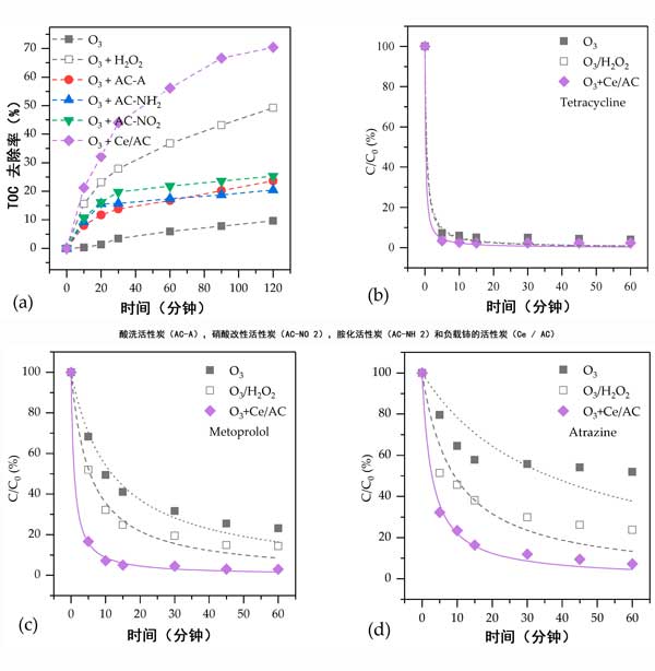 由于其可用性和可靠性,反滲透工藝已廣泛應(yīng)用于城市廢水處理廠中的水再生利用。回收75-85%的給水時(shí),會(huì)同時(shí)產(chǎn)生反滲透濃縮液,其中含有高濃度的鹽和有機(jī)物。此外,還含有各種新興污染物,如果將反滲透濃縮液直接排放到水生環(huán)境中,,盡管這些有機(jī)物的濃度較低,也會(huì)會(huì)造成嚴(yán)重的環(huán)境危害。在本研究中,制備了酸洗活性炭,硝酸改性活性炭,胺化活性炭和負(fù)載鈰的活性炭。研究了這些活性炭在反滲透濃縮液中臭氧化有機(jī)化合物的性能。提出了一種可能的機(jī)制,用于水中有機(jī)化合物的催化臭氧氧化。