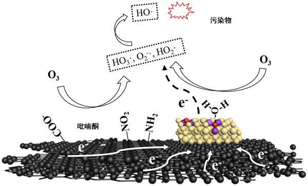 圖3:負(fù)載鈰的活性炭在催化臭氧氧化系統(tǒng)中生成·OH的可能機(jī)理。黑色:石墨烯,棕色:氧化鈰;紅色:氧空位,紫色:Ce 3+。
