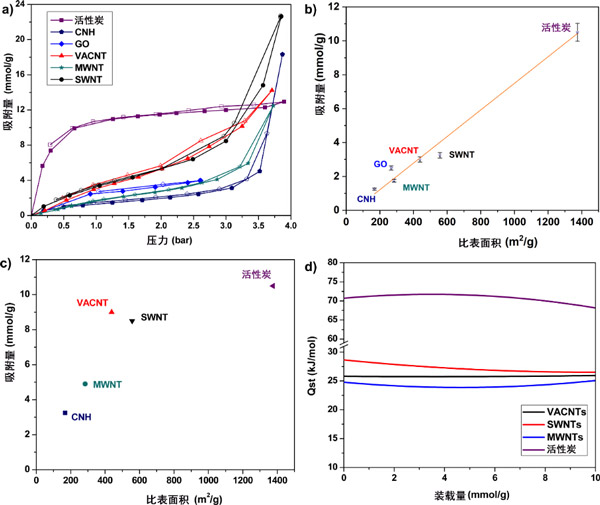 圖1顯示了不同吸附劑的示意圖。活性炭具有無(wú)序的孔結(jié)構(gòu)(圖1a),其孔隙度是由基本結(jié)構(gòu)單元的無(wú)規(guī)堆積引起的,該結(jié)構(gòu)單元可能是小于10-20環(huán)的平面芳族結(jié)構(gòu),分布在2-4層上或有缺陷的微石墨烯層。具有這種形態(tài),它代表具有擴(kuò)展的結(jié)構(gòu)紊亂的類(lèi)型學(xué)碳吸附劑。氧化石墨烯具有2D分層結(jié)構(gòu),如圖1b所示。合成氧化石墨烯的起始材料是石墨,石墨的氧化引入了氧官能團(tuán),繼而增加了層間距并使材料變成親水性。隨后的剝落步驟將各層分開(kāi),從而顯著增加其可訪(fǎng)問(wèn)的表面積,從而導(dǎo)致單層或少層氧化石墨烯的形成。在我們以前的工作中,通過(guò)XPS分析,我們發(fā)現(xiàn)氧化石墨烯上存在的氧官能團(tuán)是羥基和羧基的形式。材料在孔隙率和功能化程度方面的可調(diào)性使氧化石墨烯成為親水性碳吸附劑的原型,因此對(duì)于研究2D材料中的氣體吸附也很有趣。碳納米角具有管狀結(jié)構(gòu),在一端具有封閉的錐形尖端結(jié)構(gòu)(圖1c)。單個(gè)碳納米角通常為單壁,內(nèi)徑為2-4 nm。碳納米角的獨(dú)特特征是直徑為50–100 nm的剛性球形聚集結(jié)構(gòu)。合成后的碳納米角關(guān)閉,氣體分子無(wú)法進(jìn)入碳納米角內(nèi)部。氧化處理,例如在空氣中加熱,O 2 或CO 2用于打開(kāi)碳納米角,從而將可及表面積增加3-4倍。碳納米角具有微孔的組合,對(duì)于氣體吸附應(yīng)用很有趣,因?yàn)樗鼈兛梢源罅可a(chǎn)且純度高。