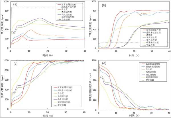為了測試活性炭在環(huán)境溫度下對氧化和去除的催化和吸附性能。這些簡化的條件與實際煙氣條件大不相同,后者具有不同的成分和雜質(zhì),并且在不同的壓力和溫度下。但是,這些條件使我們能夠簡化復雜的系統(tǒng),以更好地了解NO氧化。圖中顯示了在干燥條件下,環(huán)境溫度和壓力下不同活性炭在NO氧化過程中NO,NO 2和氮氧化物的濃度分布圖。NO氧化轉(zhuǎn)化率與運行時間的關(guān)系也可以由NO濃度來計算的。還計算了每個給定時間的NO入口和氮氧化物出口濃度之間的差異,并顯示為通過吸附去除的氮氧化物量;測試代表在相同條件下通過使用無活性炭催化劑的空反應器進行的測試。穩(wěn)態(tài)NO轉(zhuǎn)化率,氮氧化物的累積量吸附,以及所需要的時間,以達到最大的NO濃度或吸附的突然釋放NO 2的出口流中還從濃度曲線中獲得了這些元素。