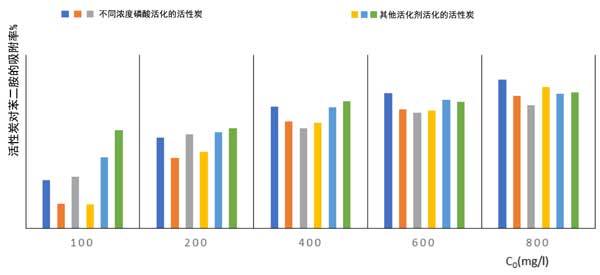 活性炭的制備在室溫下干燥之前,用蒸餾水洗滌,隨后進(jìn)行粉碎研磨處理并使用電篩篩分,以獲得63μm的均勻粉末粒度。所得粉末在使用電爐煅燒前用磷酸進(jìn)行化學(xué)預(yù)處理。根據(jù)特定比例添加磷酸來(lái)進(jìn)行活化,并在110℃的爐中干燥48小時(shí)。隨后將干燥混合物引入坩堝陶瓷中,在450℃下在爐中煅燒,使其孔隙逐漸打開。用蒸餾水徹底清洗活性炭表面的活性殘留物,該步驟用來(lái)控制活性炭的pH。這樣得到的活性炭在110℃的烘箱中再次干燥48小時(shí)獲得成品。