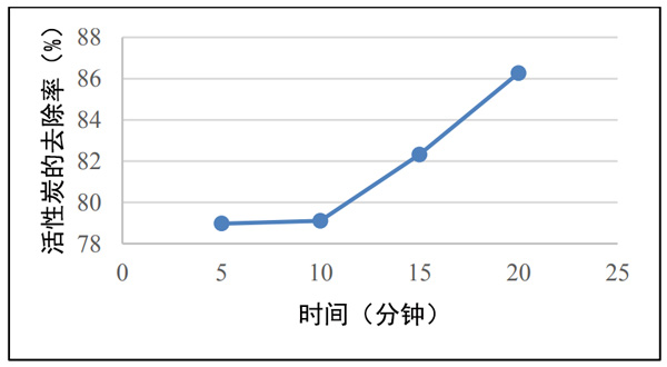 吸附時(shí)間測(cè)試:將豆腐廢液行業(yè)樣品溶液制備到四個(gè)燒杯中。在每杯中加入多達(dá)0.5克的椰殼活性炭。攪拌下靜置5分鐘,10分鐘,15分鐘,20分鐘。之后,用移液管吸取10mL溶液,然后將其放入試管中。加入0.4mL苯酚溶液,0.4mL硝普鈉,1mL氧化溶液。放置1小時(shí)以產(chǎn)生顏色。形成顏色后,使用濾紙將活性炭與樣品溶液分離。倒入比色杯,使用分光光度計(jì)對(duì)其進(jìn)行分析,讀取并記錄其在640nm波長處的吸收。時(shí)間變化的吸附用K2CO3活性炭和HCl活性炭進(jìn)行兩次。