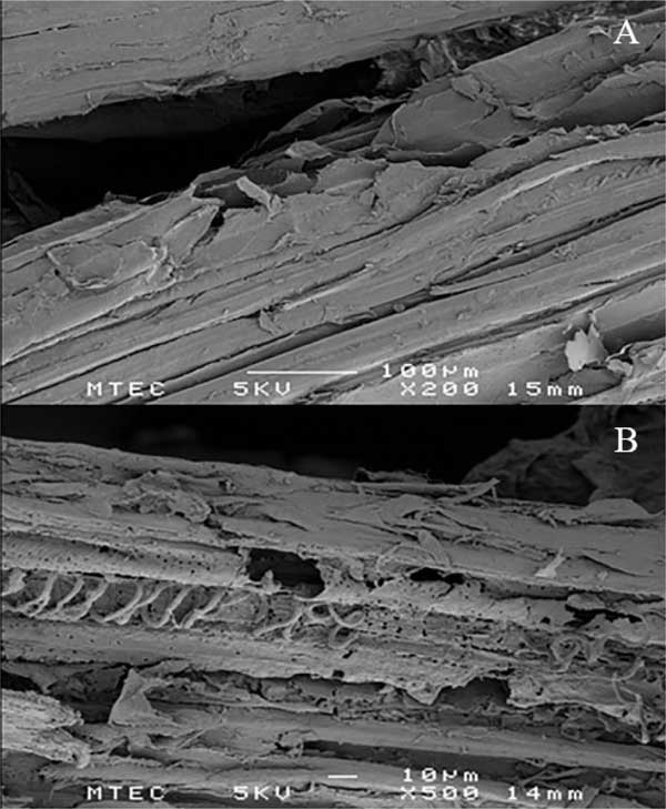 如圖3所示,將通過分離獲得的固相微結構通過SEM與天然RH進行了比較;钚蕴吭牧咸峁┝苏G彝暾谋砻,表明植物材料的高度有序的完整結構(圖3A)。分離的固體殘余物的生物質的表面結構顯示出表面和內部結構的破壞,并具有空腔和裂紋。該觀察結果表明半纖維素的去除和表面木質素的改變。對于BET表面積測量,分析了原始和預處理的生物量樣品。
