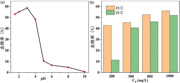 溫度也影響吸附過程?疾炝瞬煌瑴囟认虏煌瑵舛却姿崛芤旱奈竭^程,其他條件不變。結(jié)果如圖2(b)所示。對于不同濃度的乙酸稀釋劑,25℃時的吸附去除率高于35℃時的吸附去除率,表明吸附過程是放熱的。因此進一步的實驗僅在25℃下進行。對于工業(yè)應(yīng)用,室溫條件是可行的,無需提供額外的熱源。