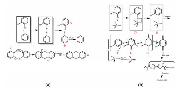 圖2:鄰氯苯酚氧化的反應(yīng)機制,包括(a)氨改性活性炭和(b)其他改性活性炭。