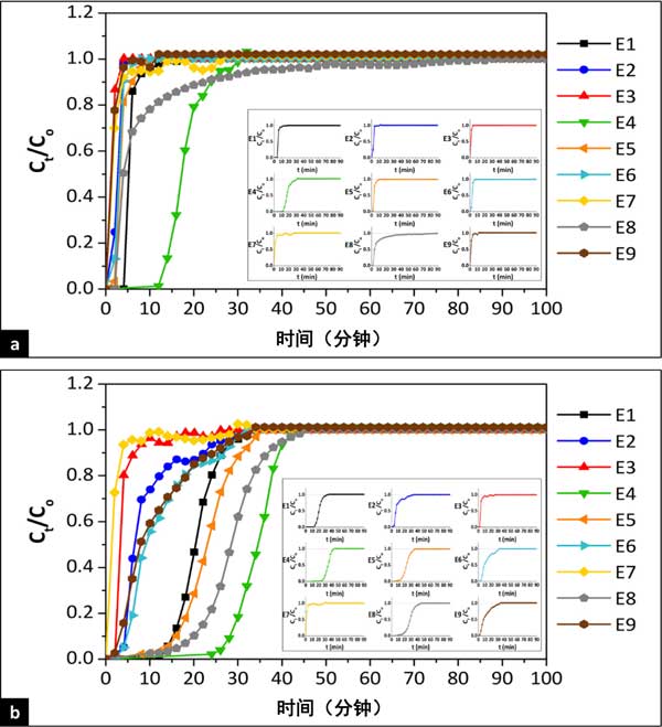 圖2:使用活性炭吸附(a)環(huán)己烷和(b)苯的突破曲線。