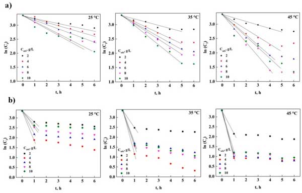 圖1:不同溫度下DNS吸附的演變(a)活性炭和(b)粉末活性炭。
